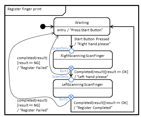 FingerPrintRegister.png is the parent state machine. It uses ScanFinger as a sub-machine twice. In this scenario, alive checking is not required. So, the parent machine uses ScanOnly enty_pt. In another scenario, not mentioned here, might require the normal entry into ScanFinger to check the finger is alive.